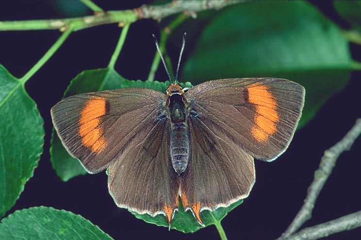 | The blood has been pumped back to dry the wings. | Ready! The Brown Hairstreak shows its underside .... | ... and its top side. | |